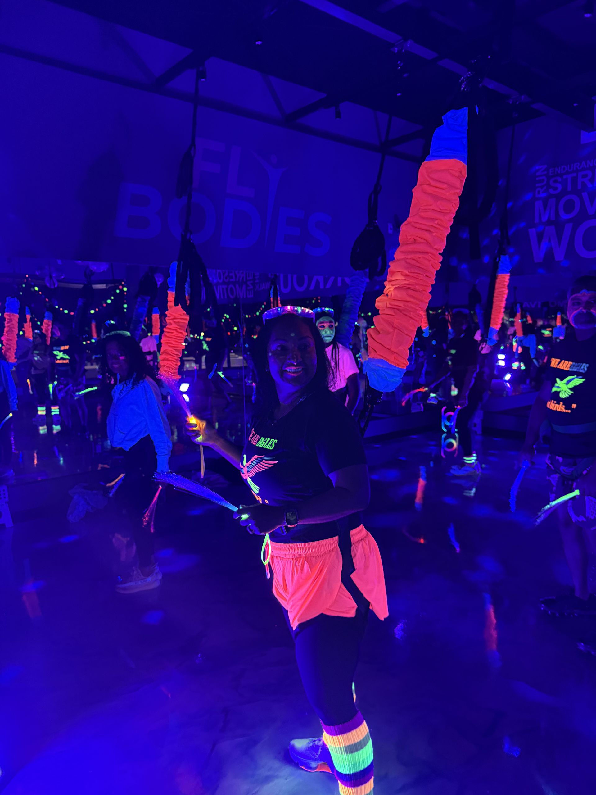 Glow-in-the-Dark Bungee Fitness isn’t just a workout – it’s an experience. Under the glow of black lights, participants gear up with neon or white attire and glow-in-the-dark paint, transforming the fitness studio into a vibrant, energetic space. Here’s what makes this class stand out:
